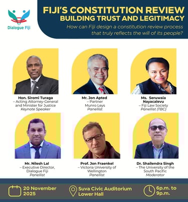 The upcoming public discussion focuses on ensuring Fiji’s constitutional review process is legitimate, inclusive, and reflects the will of the people. With government expected to table constitutional amendment-related legislation, Dialogue Fiji says national conversations on trust, participation, and process are crucial.