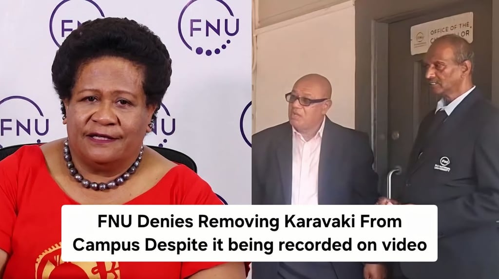 In a bizarre turn of events, the Fiji National University has issued a statement denying that its Council Chairman and Chancellor, Semesa Karavaki, was blocked or removed from campus — despite the incident unfolding publicly during a live media interview.